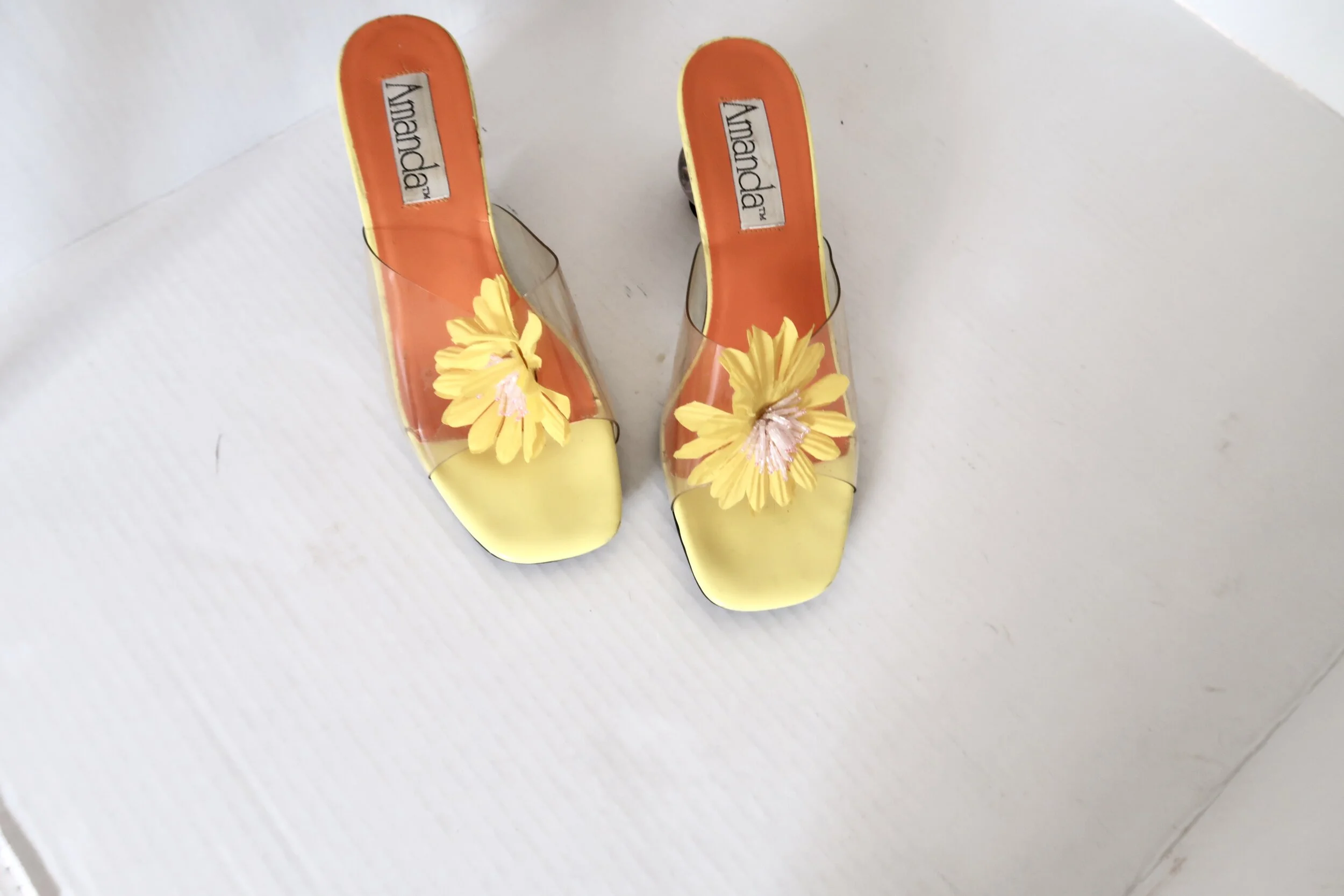 Vintage Sunflower daydream mule. Features a glued flower, clear plastic material, Perspex ball heel. A sweet shoe spice it up with a sock. Due to pre loved wear there is slight scuffing.